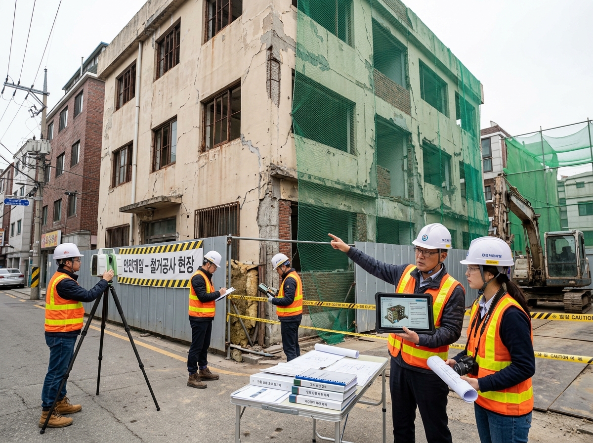 도심지 해체 공사는 인접 건물 균열·침하, 보행자 낙하물 위험을 수반합니다. 체계적인 안전 대책으로 주변 피해를 방지합니다.