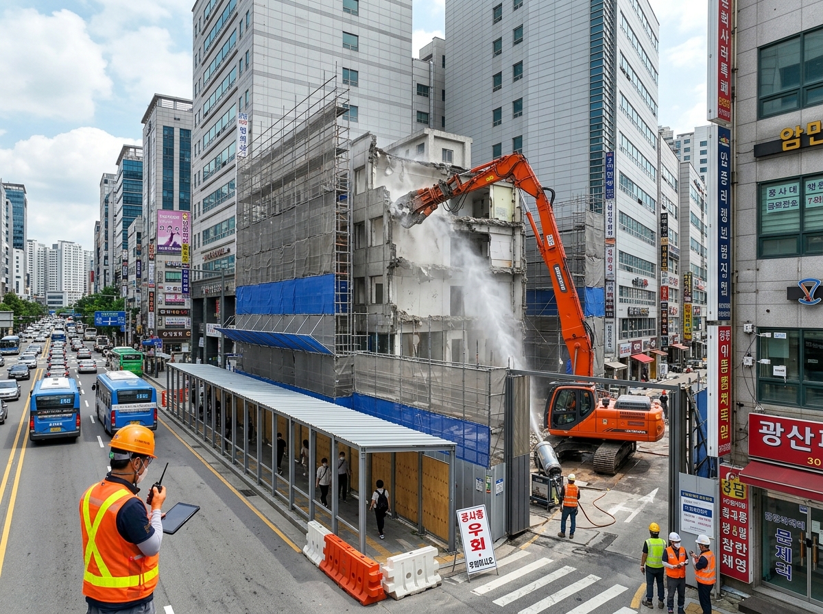 도심지 해체 공사는 인접 건물 균열·침하, 보행자 낙하물 위험을 수반합니다. 체계적인 안전 대책으로 주변 피해를 방지합니다.